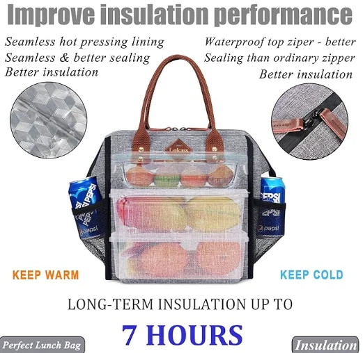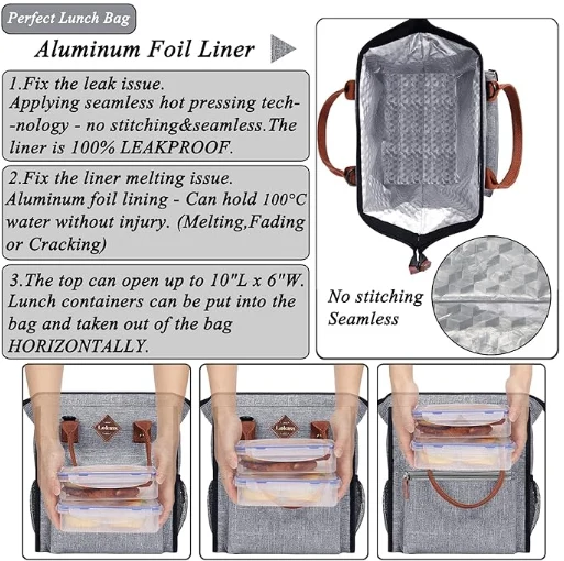 Kunja kwa luminium alullum chivundikiro cholumikizira cha 100%, chosavuta kuyeretsa ndipo sichisungunuka mosavuta. Nsalu ya nayiloni ndi yopanda madzi ndipo zipper wapamwamba ndi madzi. Nchito za madzi okonda madzi komanso omwe ali ndi vuto la thumba la nkhomaliro ili labwino.